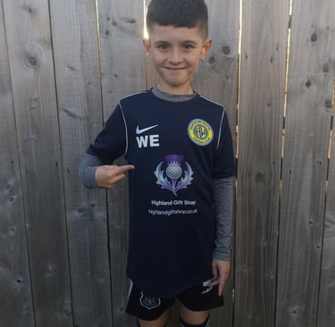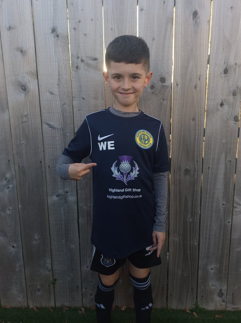 The partnership was unveiled with a heart-warming photo of young William, my nephew, proudly sporting the team’s brand-new kit emblazoned with the Highland Gift Shop logo. The sleek new shirts reflect both team spirit and local pride, blending the energy of grassroots football with the warmth of community support.
